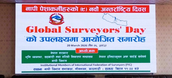 The 9th Global Surveyors’ Day was observed on March 20, 2026, in Nepal with a formal ceremony organised by the Nepal Institution of Chartered Surveyors (NICS), in association with the Survey Department of the Government of Nepal. Although the Day is globally marked on 21 March each year, this year’s celebration was held a day in advance, as 21 March falls on a Saturday.